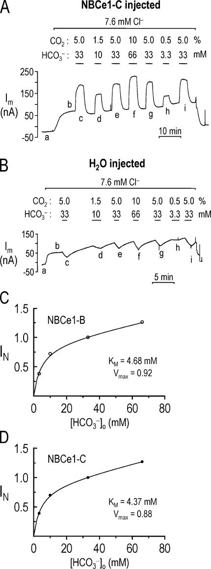 Figure 6. External HCO3−-dependencies of NBCe1-B and -C. (A) A voltage-clamped oocyte (Vh = −60 mV) expressing NBCe1-C was exposed to different HCO3−-containing solutions at a constant [Cl−] of 7.6 mM. (B) The experimental protocol used in A was performed on an H2O-injected oocyte. (C) Normalized HCO3−-induced currents as a function of external [HCO3−] for oocytes expressing NBCe1-B (r2 = 0.99). HCO3−-induced outward currents in experiments similar to that in A were normalized to the mean currents elicited by the flanking exposures to the standard 5% CO2/33 mM HCO3− solution. (D) Normalized HCO3−-induced currents as a function of external [HCO3−] for oocytes expressing NBCe1-C (r2 = 0.99).