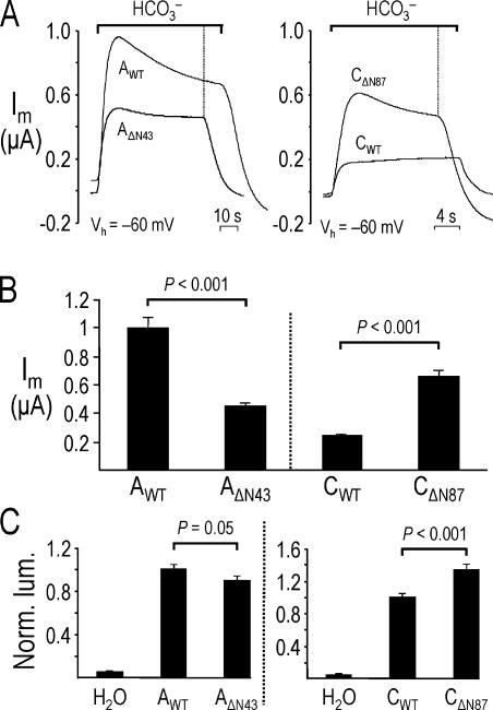 Figure 9. Changes in NBCe1 activity elicited by removing the different amino termini. (A, left) An oocyte expressing mutant AΔN43 displayed a peak HCO3−-induced outward current that was ∼50% smaller than seen in the oocyte expressing AWT. (A, right) An oocyte expressing mutant CΔN87 displayed a peak HCO3−-induced outward current that was approximately threefold larger than seen in the oocyte expressing CWT. (B) Summary of HCO3−-induced outward currents from experiments similar to those shown in A. n ≥ 15 for each bar. (C, left) The mean normalized luminescence (Norm. Lum.) was 10% lower for AΔN43 compared with AWT. n ≥ 19 for each bar. (C, right) The mean Norm. Lum. was 33% higher for CΔN87 compared with CWT. n ≥ 23 for each bar.
