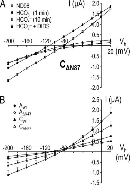 Figure 10. Current–voltage (I-V) relationships from oocytes expressing wild-type and amino-terminal truncations of NBCe1 variants. (A) Representative experiment on an oocyte expressing CΔN87 in which I-V plots were obtained with the oocyte initially bathed in ND96 (diamonds), followed by 1 min in 5% CO2/33 mM HCO3− (circles) and then 10 min in the physiological buffer (squares), and finally in the HCO3− solution containing 200 μM DIDS (triangles). (B) HCO3−-dependent I-V plots for NBCe1-A (closed diamonds), AΔN43 (open diamonds), NBCe1-C (closed triangles), and CΔN87 (open triangles). Data were obtained from experiments similar to that shown in A. n = 3 for each data point from a single batch of oocytes. SEM bars smaller than symbol sizes are not shown. Similar results were obtained from a second batch of oocytes.