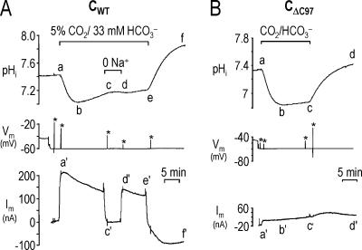 Figure 11. Lost activity of CΔC97 expressed in oocytes. (A) pHi (top trace), voltage (middle trace), and current (bottom trace) were measured simultaneously in an NBCe1-C–injected oocyte that was initially bathed in ND96. The oocyte was then voltage clamped and exposed to a solution containing 5% CO2/33 mM HCO3− during segment ae. Electrogenic NBC activity was evident from the instantaneous outward current (a'), and the pHi recovery (bc) following the initial CO2-induced acidification (ab). Removing Na+ blocked the pHi recovery (cd), and reversed the hyperpolarization (c'). (B) The same experimental protocol in A was performed on a CΔC97-injected oocyte. Exposing the oocyte to CO2/HCO3− elicited only a small outward current (a'), and minimal pHi recovery (bc) following the initial decrease in pHi (ab).