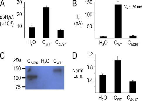 Figure 12. Lost activity of CΔC97 expressed in oocytes due to poor expression at the plasma membrane. (A) Summary data of the segment-bc pHi recovery rates from experiments similar to those shown in Fig. 11, top traces. n ≥ 4 for each bar. (B) Summary of H2O-subtraced, HCO3−-induced currents from experiments similar to those shown in Fig. 11, bottom traces. For each bar, n ≥ 6 from two batches. (C) Immunoblot analysis of total microsomal protein from single oocytes injected with H2O, CΔC97 cRNA, and CWT cRNA. An NBCe1 antibody labeled bands of the expected sizes: ∼130 kD for CWT and ∼118 kD for CΔC97. No labeling was observed in protein from an H2O-injected oocyte. (D) The mean normalized luminescence (Norm. Lum.) for oocytes injected with CΔC97 and H2O are similar. n ≥ 10 from two batches of oocyte.