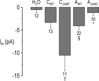 Figure 15. Summary macropatch data from experiments similar to those shown in Fig. 14 on oocytes injected with H2O, CWT, CΔN87, AWT, and AΔN43. The mean HCO3−-induced macropatch current for CΔN87 is 3.2-fold larger than the mean current for CWT (†, P = 0.03). The mean HCO3−-induced currents for AWT and CWT are similar (§, P = 0.32), and both are larger than the mean current seen in H2O-injected oocytes (P < 0.05). The mean current for AΔN43 is 71% smaller than that of AWT (*, P < 0.01). n values are shown under bars.