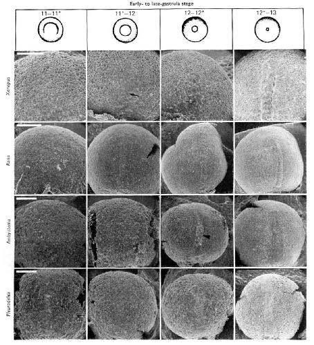 A scanning electron microscopic, comparative survey of notochord and somite formation including some details of change in cell morphology and arrangement, was made of selected stages of two species of anuran amphibians (Xenopus laevis and Rana pipiens) and two species of urodeles (Ambystoma mexicanum and Pleurodeles waltlii). The ectoderm or neural plate was removed from fixed embryos and the dorsal aspect of the developing notochord and somitemesoderm was photographed. Micrographs of comparable stages of all species were arranged together to form an atlas of notochord and somite formation. Similar morphogenetic events occur in the same sequence in the four species. Notochordal cells become distinguishable from paraxial mesodermal cells by shape, closeness of packing, and arrangement. Notochordal elongation is accompanied by a decrease in cross-sectional area and by cell rearrangement. Somitic mesoderm becomes distinguished from lateralmesoderm by a change in cell shape and orientation, followed by segmentation of somites. The schedule of somite formation was compared and related to the staging series for each species. The urodeles differ from the anurans in that the notochordal region in the early neurula stages in triangular, with the broadest part in the posterior region of the embryo. In anurans it is uniform in width. This difference may reflect differences in gastrulation and in the mechanism of elongation of the posterior part of the embryo in the neurula.