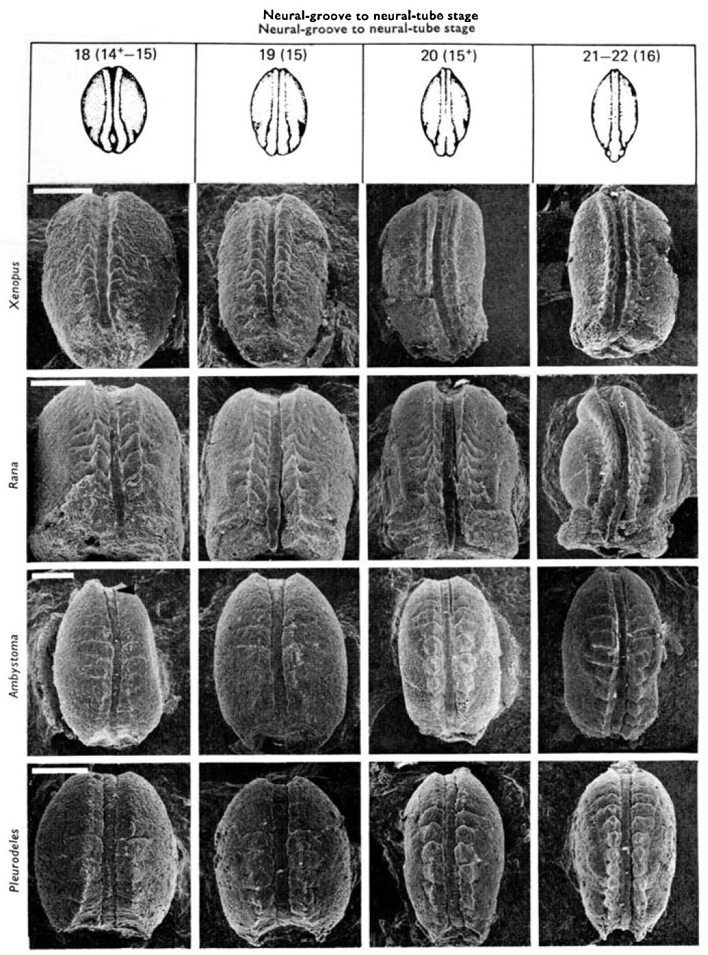 Rana are in parentheses. Pointer at stage 18 of Ambystoma indicates the rod-like