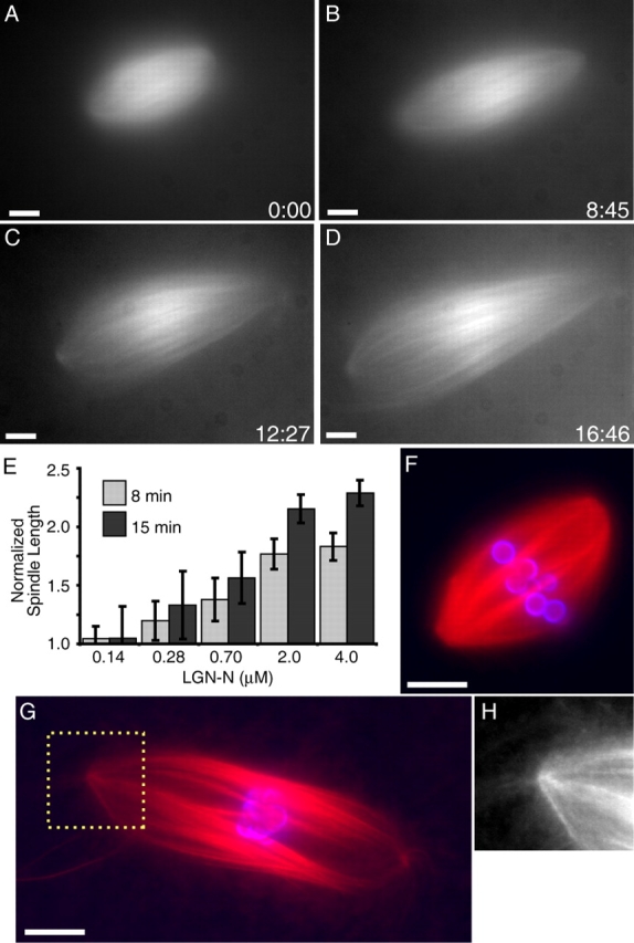 Figure 3. NuMA inhibition with LGN-N increases the length of spindle microtubules, in the presence or absence of centrosomes. (A–D) Tubulin distribution in an LGN-N–treated spindle (0.7 μM, added ∼3 min before image at t = 0) during live recordings (Video 5). (E) LGN-N was added to assembled spindles, samples were fixed after 8 or 15 min, spindle lengths were measured (mean ± SD, n = 15, two independent experiments), and normalized to the length of untreated spindles (40 μm). (F–H) Spindles assembled in the absence of centrosomes, around DNA beads (tubulin, red; DNA, blue). (F) Buffer control. (G) LGN-N–treated (2 μM, 8 min). (H) Higher magnified image of the region indicated in G. Times are in min:s. Bars, 10 μm.