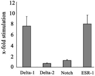 Fig. 3. The expression levels of Delta-1, Delta-2, Notch and ESR-1 in MyoD-injected animal caps. Animal caps were dissected from stage 9 embryos which were injected with 300 pg of MyoD mRNA into animal pole at 2-cell stage, and then cultured for 3 hours. The expression levels of Delta- 1, Delta-2, Notch and ESR-1 mRNA were quantified by real-time RT-PCR. The relative stimulation fold was calculated as the individual expression in MyoD-injected animal caps relative to that in untreated animal caps. The efficiency of cDNA synthesis from mRNA was assessed on the basis of real-time RT-PCR for ODC. The results represent the mean from three independent experiments, and error bars indicate the SEM.