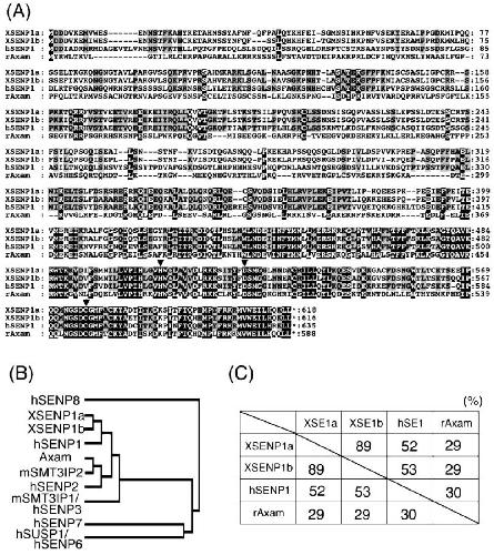 XSENP1s ( XSENP1a, XSENP1b) and hSENP1 are boxed with grey. ( B) Estimated evolutionary relationship of XSENP1s with other