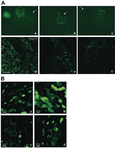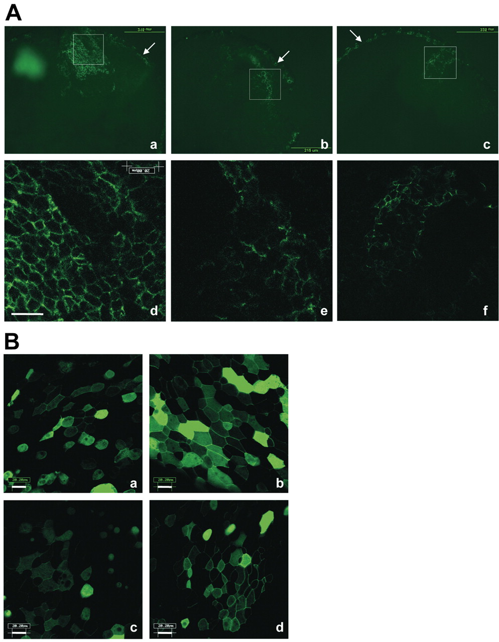 Localization of JMD-deleted E-cadherin and αE-catenin-EGFP in fixed and living embryos. (A) Immunohistological examination of mE-cadhδJMD expression in transverse sections of stage 21 embryos. Embryos were injected at the 16-cell stage and fixed for sectioning at stage 21. After sectioning, immunohistochemical staining was performed to localize mE-cadherinδJMD proteins, and sections were examined with a fluorescence (a-c) or a laser scanner confocal microscope (d-f). Embryos injected with mE-cadhδJMD (500 pg) alone show a high and uniform concentration of mE-cadherinδJMD at the cell-cell contacts in the cranial NCCs (a,d). Expression of mE-cadherinδJMD in embryos co-injected with dominant negative (DN) Rac (50 pg) is more scattered (b,e) while an overall reduced staining is observed upon co-injection of 150 pg wild type (WT) RhoA RNA (c,f). All sections are oriented with dorsal side up. Staining in the ectoderm is indicated by an arrow, and the boxed area in the migrating neural crest cells is examined by confocal microscopy. Scale bar, 20 μm. (B) Confocal in vivo analysis of the ectodermal cell layer in tailbud-stage embryos injected at the 16-cell stage in the ventral-animal region with a plasmid encoding αE-catenin-EGFP alone (a) or with the plasmid in combination with 500 pg mE-cadhδJMD RNA (b) and additionally 50 pg DN Rac (c) or 150 pg WT RhoA RNA (d). While injection of mE-cadherinδJMD induces strong localization of αE-catenin-EGFP at the cell-cell contacts, this is greatly reduced upon co-injection of DN Rac but not by WT RhoA. Scale bars, 20 μm. |