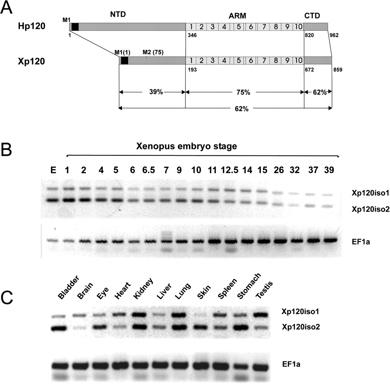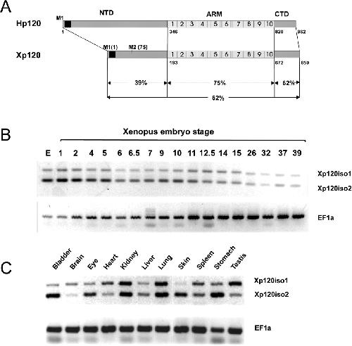 Comparison of Xenopus and human p120 sequences and RT-PCR analysis of p120 expression during early embryonic development and in adult Xenopus tissues. (A) Linear representation of the amino acid sequence similarities between hp120 1ABC and Xp120 isoform 1. In the Xenopus p120 sequence, two translational start sites (M1 at position 1 and M2 at position 75) are indicated. Isoform 2 is derived by splicing, which takes place upstream of M1. A conserved coiled-coil domain in the N-terminal region of p120 is shown (black box). Percentages indicate the similarities of the sequences of Xp120 isoform 1 and hp120 1ABC for the whole protein (calculated with Needleman-Wunsch algorithm from EMBOSS) and for the N-terminal domain (NTD), the central domain (ARM) or the C-terminal domain (CTD) (calculated with the Clustal W method from the GCG program, BEN, Brussels). The Xenopus p120 sequence data are available from EMBL/GenBank under accession numbers AF150743 and AF150744. (B) A semi-quantitative RT-PCR evaluation of Xp120 isoform expression in embryos at different developmental stages and (C) in selected tissues derived from an adult frog. The PCR band of 500 bp is amplified when the NH2-terminal insert of 210 nucleotides is present (Xp120iso1). The band of 290 bp represents the shorter isoform of Xp120 (Xp120iso2). An RT-PCR reaction of elongation factor 1 (EF1a) was used as a loading control.