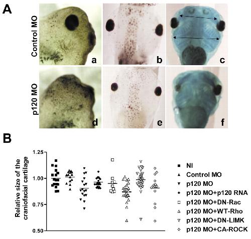 Expression of p120 morpholino (MO) affects the size of the eyes and cartilage. (A) Injection of p120 MO at 8- to 16-cell stage in the region that gives rise to the head results in the formation of smaller eyes or their complete loss (d,e) compared with control MO-injected embryos (a,b). Tadpoles are shown alive at stages 33 (a,d) and 42 (b,e), or fixed and stained by Alcian Blue to reveal the cartilage structures at stage 46 (c,f). Next to smaller or absent eyes, embryos injected with p120 MO also show smaller craniofacial cartilage structures (f) compared with control MO-injected embryos (c). (B) Graph representing the effect of p120 MO on the size of the craniofacial skeleton. For clarity of the figure, representative experiments are shown. The width of the head was calculated by taking the sum of both arrows indicated in A,c. Values were divided by the average value of non-injected embryos. The head size of embryos injected with p120 MO is statistically different from that of the control population (P=0.0068, Student's t-test). This effect can be rescued by co-injection of RNA encoding Xp120 (30 pg), dominant negative (DN) Rac (33 pg), or DN LIMK (500 pg). Wild type (WT) Rho (125 pg) and CA ROCK (150 pg) are unable to rescue the effect of p120 MO on the size of the head. |