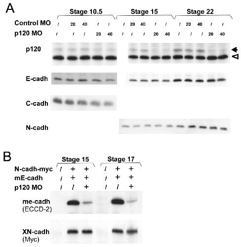 Knockdown of p120 expression results in the downregulation of C- and E-cadherin proteins but not of N-cadherin. (A) An amount of 20 ng or 40 ng of control MO or p120 MO was injected at the 1-cell stage. Embryos were lysed at stages 10.5, 15 and 22 and analyzed for expression of p120 and C-, E- and N-cadherin. Injection of p120 MO leads to a dose-dependent downregulation of p120 (arrow). The strong band indicated by the open arrowhead is nonspecific and serves as a loading control. Next to a loss of p120 expression, lower levels of C-cadherin and E-cadherin can be observed. Levels of N-cadherin are not affected. (B) RNA (500 pg) encoding mE-cadherin or Myc-tagged XN-cadherin was injected at the 1-cell stage together with control MO or p120 MO (20 ng). Embryos were lysed at stages 15 and 17 and analyzed for expression of ectopic mE-cadherin and Myc-tagged XN-cadherin. While the expression levels of mE-cadherin are dramatically reduced upon the co-injection of p120 MO, the levels of ectopic XN-cadherin are not affected. |