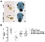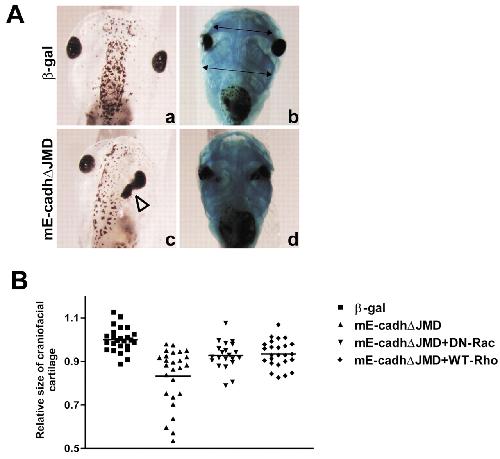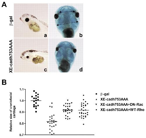 Expression of p120-uncoupled E-cadherin affects the size of the eyes and cartilage. (A) Embryos were injected at the 8-cell stage in the dorsal-animal region and scored at stage 42 for the eye phenotype (a,c) and stage 46 for the cartilage phenotype after Alcian Blue staining (b,d). Tadpoles injected with 2 ng XE-cadh753AAA showing one smaller eye (c,d) compared with control injected embryos (a,b). (B) Graph representing the effect of XE-cadh753AAA RNA on the size of the craniofacial cartilage. Three normalized experiments are represented in one graph. The size of the head was calculated as in the legend of Fig. 3. The effect of XE-cadh753AA can be partially rescued by co-injection of 150 pg wild type (WT) RhoA or 50 pg dominant negative (DN) Rac (values are statistically different from those injected with XE-cadh753AAA RNA alone). |