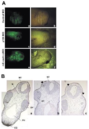 Disturbance of cranial neural crest cell (NCC) migration upon injection of p120 morpholino (MO) or RNA-encoding JMD-deleted E-cadherin. (A) Tracing of cranial NCCs migrating into the branchial arches. Embryos were injected at the 4-cell stage with caged Fluorescein-dextran in combination with control MO (a,b), p120 MO (c,d) or mE-cadhδJMD RNA (e,f). At stage 14, the Fluorescein was activated with UV light in the region where the NCCs originate. Embryos injected with control MO show the three wide streams of migrating cranial NCCs (a,b). Depletion of p120 (c,d) or overexpression of mE-cadhδJMD (e,f) leads to disturbance in the migration of the NCCs. The three streams do not go as deep as in the control MO-injected embryos and they are not as wide (c,d and e,f, respectively). Dotted lines (b,d and f) show a projection of the three streams (a,c and e, respectively). (B) Transverse histological sections of the head of stage 26 embryos. Embryos were injected with mE-cadhδJMD at the 4-cell stage and fixed for sectioning at stage 26. Transverse section of the head of a non-injected embryo (a), showing the neural tube (NT), the notochord (N), the eyes (EY), the pharynx (PH) and the cement gland (CG). Embryos injected with mE-cadhδJMD (b,c) show clumps of intimately associated cells in close proximity to the neural tube or still attached to the neural tube (arrowheads).