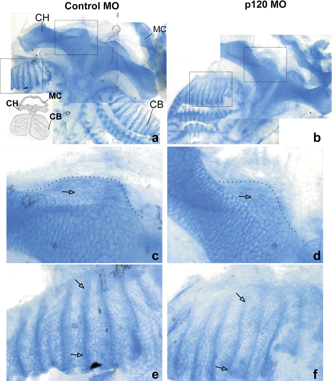 Malformation of the jaws as a result of p120 depletion. Dissected craniofacial cartilage structures stained with Alcian Blue. The inset in (a) shows a schematic of the different craniofacial cartilage structures, including Meckel's cartilage (MC), ceratohyal (CH) and ceratobranchial cartilage (CB). All these structures are still present upon p120 knockdown (b) but are smaller compared with control MO-injected embryos (a). Boxed regions are enlarged in c-f. Higher magnification shows that the ceratohyal cartilage is less dense and delineated in embryos injected with p120 MO (d, see arrow and dotted line) compared with the same area in embryos injected with control MO (c). The same is true for the ceratobranchial cartilage (e,f), where the two arrows point out a ridge that is clearly less dense and composed of fewer cells in p120 MO-injected embryos. |