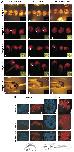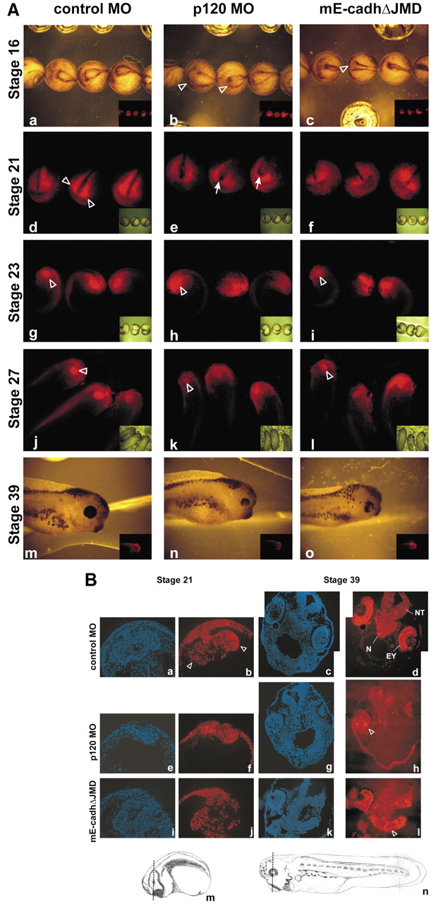 Abnormal evagination of the eye vesicles in embryos injected with p120 morpholino (MO) or RNA encoding JMD-deleted E-cadherin. (A) Embryos were injected at the 32-cell stage with Rhodamine-dextran and MO or RNA in two blastomeres in the region that contributes to the eye. At stage 16, knockdown of p120 leads to defects in the anterior loop structure of the closing neural tube (b, arrowheads). This can also be observed in a minority of embryos injected with mE-cadhδJMD (c, arrowhead) but not in embryos injected with control MO (a). At stage 21 the evagination of the eye has clearly started in control MO-injected embryos (d, see arrowheads). In embryos injected with p120 MO (e) and mE-cadhδJMD RNA (f) this process is disturbed. At this stage the anterior neuropore of p120 MO-injected embryos is still open (arrow in e). At early and late tailbud stages (stages 23 and 27) the control MO-injected embryos show a nicely formed eye (g,j, see arrowheads) compared with the p120 MO-injected embryos (h,k, see arrowheads). Expression of mE-cadhδJMD also leads to a disturbance of the eyes at early and late tailbud stages (i and l, see arrowheads). At stage 39, control MO-injected embryos show nicely formed eyes (m), compared with p120 MO-injected embryos, which exhibit smaller eyes (n), or mE-cadhδJMD injected embryos, which have malformed eyes (o). (B) Transverse sections of Rhodamine-injected and DAPI stained embryos at stage 21 and 39. At stage 21, the embryos injected with control MO show a good evagination of the eye vesicles from the neural tube (a,b, see arrowheads). This morphogenetic process is clearly aberrant in embryos injected with p120 MO (e,f) or mE-cadhδJMD (i,j) (see text for details). A schematic indicating the site of the section is shown in (m). At stage 39 embryos injected with control MO have eyes with a proper stratification of the retinal layers (c,d). The brain or neural tube (NT), the notochord (N) and the eyes (EY) are indicated. Eyes are smaller and the retinal stratification is lost in embryos injected with p120 MO (g,h, see arrowhead). Embryos expressing mE-cadhδJMD show stratification of the retina, but the eyes are malformed and are not well separated from the brain (k,l, see arrowhead). A schematic indicating the site of the section is shown in (n). |