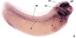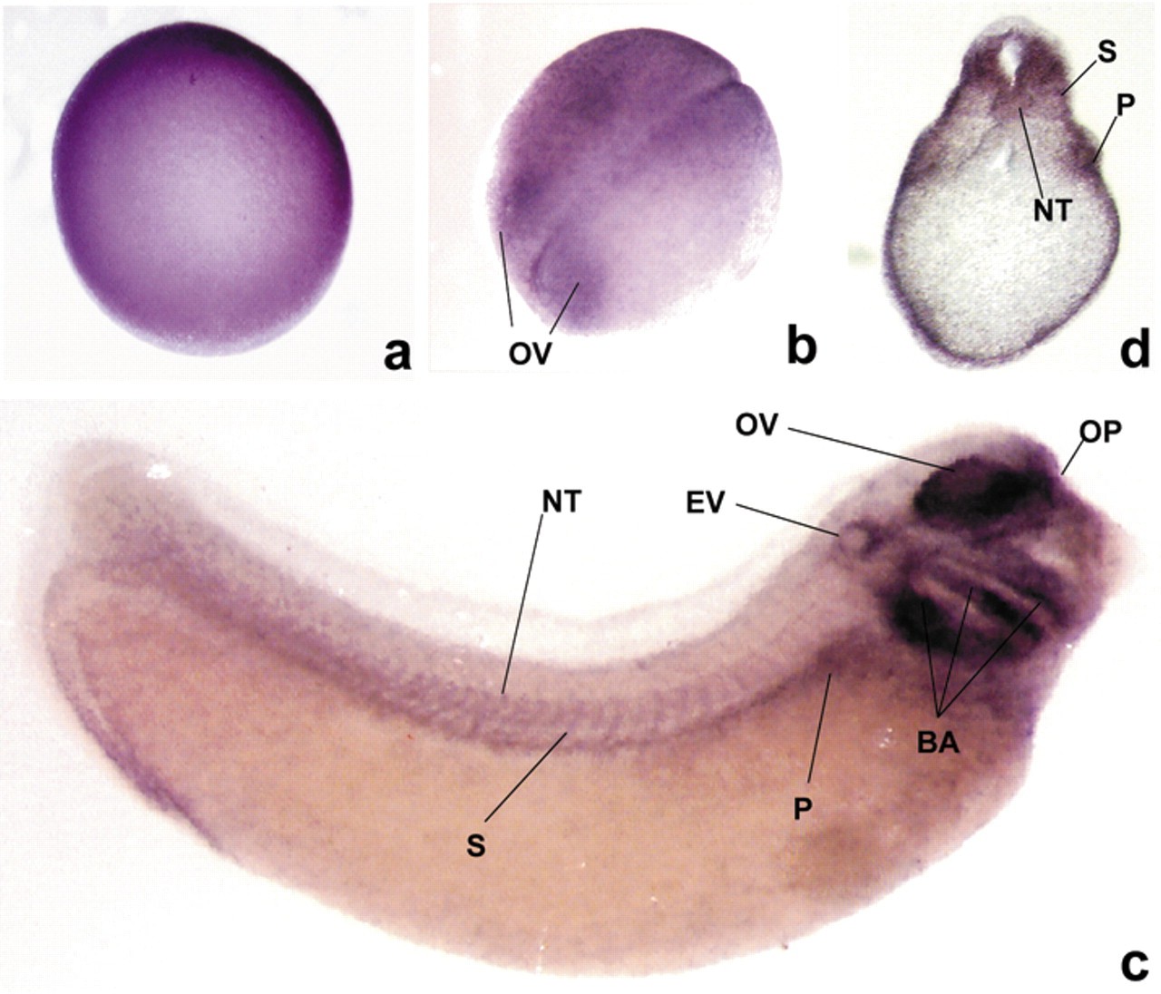 Fig. 2. Analysis of p120 expression in early Xenopus embryos by whole mount in situ hybridization. Spatial expression of p120 was evaluated by whole mount in situ hybridization using an antisense Xp120iso1 RNA probe. Expression of p120 is enriched in the animal hemisphere at the blastula stage (a); the optic vesicles (OV) at the neurula stage (b); the optic vesicle (OV), ear vesicle (EV), olfactory placode (OP) and branchial arches (BA) in the head region and also the somites (S), notochord (NT) and pronephros (P) at tailbud (stage 30) (c). (d) Transverse section through a stage 30 tailbud embryo showing increased p120 expression in somites, notochord and pronephros. |
