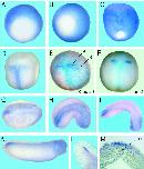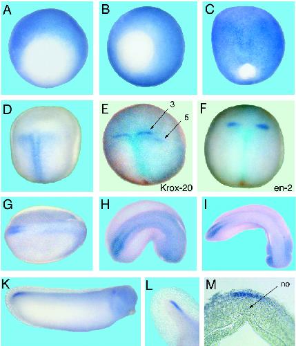 Localization of Oct-25 transcripts in Xenopus laevis embryos. Whole mount in situ hybridizations were performed with embryos of various developmental stages (24). A, stage 9. B, stage 11. C, stage 12. D-F, stage 15. E, double whole mount with Krox-20/Oct-25(BM-purple/5-bromo-4-chloro-3-indoyl-phosphate (BCIP)); rhombomeres 3 and 5 are indicated. F, double whole mount with en-2/Oct-25(BM-purple/BCIP), the former staining the midbrain/hindbrain boundary. G, stage 19. H, stage 23. I, stage 27. K, stage 30. L, tip of the tail at stage 35. M, transverse section of a stage 14 embryo. no, notochord.