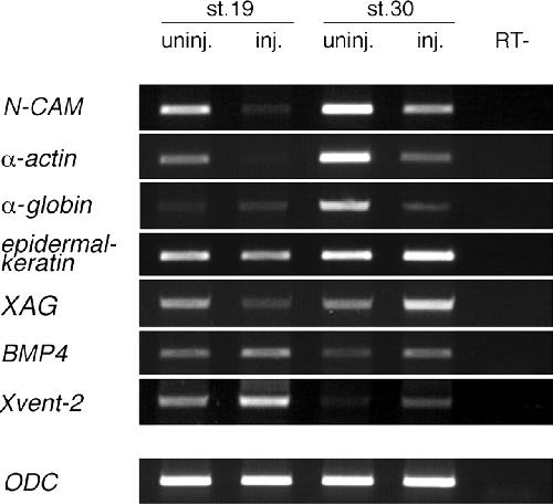 Oct-25 overexpression inhibits terminal differentiation. Embryos were injected (inj.) with 600 pg of Oct-25 RNA at the 4-cell stage and grown until uninjected (uninj.) control embryos had reached stage 19 (st. 19) or stage 30 (st. 30), respectively. Total RNA was prepared from uninjected and injected embryos and analyzed by RT-PCR for indicated transcripts. Ornithine decarboxylase (ODC) was used as internal standard, and control reaction without reverse transcriptase (RT-) was used as a control for the absence of endogenous DNA. N-CAM, neural cell adhesion molecule; XAG, Xenopus anterior gradient.