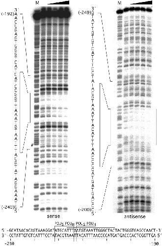 DNase I footprint of the Oct-25 binding site on the Xvent-2B promoter. The -305 to -123 upstream region of the Xvent-2B gene was cloned in sense and in antisense orientation. After 5′-end labeling with 32P the DNA fragments were submitted to DNase I footprinting using bacterially expressed Oct-25 protein. The M lanes denote the G/A chemical sequencing reactions, and the next lane contains DNase I-digested free DNA. The next four lanes contain the reactions with increasing amounts of Oct-25 protein (triangle). The vertical bars indicate protected regions, which at the bottom are shown to correlate for the sense and antisense strands (horizontal bars). Note that the protected region contains two putative POU factor binding motifs, each of them containing a binding site for the POU-specific domain (POUS) and for the homeodomain (POUH).