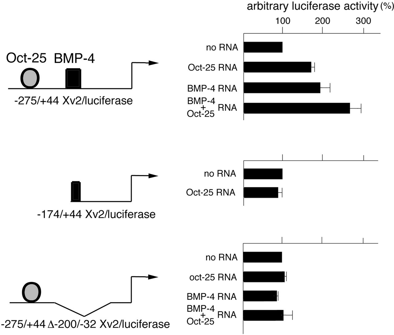 Oct-25 stimulates Xvent-2B transcription. The Xvent-2B upstream region (-275/+44), the 5′-deletion (-174/+44), or the -275/+44 region carrying an internal deletion (δ-200/-32) was fused to the luciferase reporter gene. 20 pg of DNA were co-injected into both blastomeres at the 2-cell stage of Xenopus embryos with Oct-25 RNA (250 pg) and/or BMP-4 RNA (300 pg) as indicated. Luciferase activity was measured at stage 12. The reporter activities determined in the absence of RNA were set as 100%. All values are averaged from at least three independent experiments.