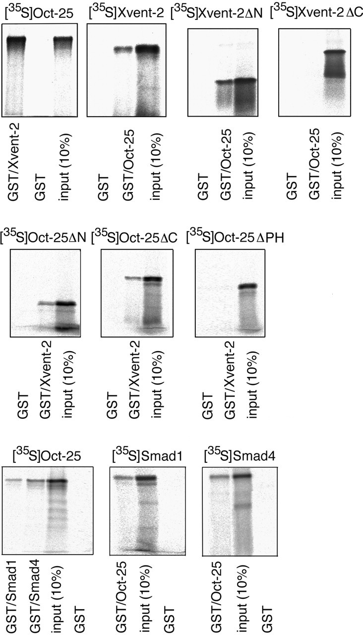 Interaction of Oct-25 with components of the BMP signaling pathway. Oct-25, Smad1, Smad4, Xvent-2, N terminus-truncated (δN) and C terminus-truncated (δC) versions of Xvent-2 and Oct-25, and an Oct-25 mutant lacking the POU and the homeodomain were labeled with [35S]methionine by in vitro transcription/translation and incubated with GST or GST fusion proteins as indicated. The pull-down reactions were washed and analyzed by 10% SDS-PAGE.
