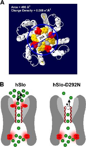 Figure 7. . A molecular and functional model of the pore region. (A) Simple estimate of the surface charge density in hSlo by considering the area delimited by the circle (25 Å diameter). A surface charge density of ∼0.008 e−/Å2 can be estimated for the area including the four negative charges of the D292 residues. This value is very close to the fitted value of 0.0077 e−/Å2. (B) Cartoon representation of the proposed role of D292 as a site for accumulating K+ ions in the outer vestibule. The selectivity filter is depicted with five K+ binding sites. The reduced [K+] in the outer vestibule of hSlo-D292N results in reduced accessibility of K+ to the outer binding site of the selectivity filter. Inner negative charge residues participating in ion conduction are shown at the bottom of the inner vestibule (Brelidze et al., 2003; Nimigean et al., 2003).