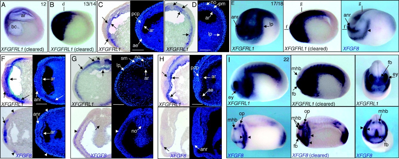 Figure 3. Spatiotemporal expression of XFGFRL1/Xndk at late gastrula to neural tube stages visualized by whole-mount in situ hybridization. Hybridization probes used for XFGFRL1 and XFGF8 are as indicated in the pictures (XFGFRL1 in black; XFGF8 in blue). ldquo cleared, rdquo embryos were treated with benzyl benzoate/benzyl alcohol to become transparent. Numbers indicate developmental stages (Nieuwkoop and Faber, [1967]). A: Lateral view of late gastrula. Anterior toward the left; dorsal is upward. B: Lateral view of early neurula. Anterior toward the left; dorsal is upward. C: Sagittal section of early neurula (stage 13/14). D: Transverse section of early neurula (stage 13/14). The section corresponds to the position shown by a line with d in B. E: Anterolateral (left) and lateral view (middle; anterior toward the left; dorsal is upward) of XFGFRL1 and XFGF8 (right) expression at neurula. Arrowhead, ventrolateral expression in a crescent shape. F,G: Horizontal (F) or transverse (G) section of neurula (stage 17/18). The planes of section are indicated by a line with f or g in E. Arrowheads in lower panels indicate that crescent-shaped expression (see E, right panel) is seen in the sensorial layer of epidermis. H: Sagittal section of neurula (stage 17/18). I: Lateral (left and middle panels; anterior toward the left; dorsal is upward) and anterior view (right panels; dorsal is upward) of neural tube stage embryos. Crescent-shaped expression (see E, right panel) is separated into two stripes as indicated by arrowheads (see I, lower panels). C,D,F-H: Sections of stained embryos are shown in brightfield (left) and DAPI (4 prime ,6-diamidine-2-phenylidole) staining (right). XFGFRL1, Xenopus fibroblast growth factor receptor-like 1; XFGF8, Xenopus fibroblast growth factor-8; ae, anteriorendoderm; anr, anterior neural ridge; ar, archenteron roof; bc, blastocoel; ey, eye; fb, forebrain; lp, lateral plate; mhb, midbrain-hindbrain boundary; no, notochord; op, otic placode; pcp, prechordal plate; pm, paraxial mesoderm; sm, somitic mesoderm. Scale bars = 200 mu m in C,D,F-H.