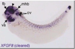 fgf8 (fibroblast growth factor 8 (androgen-induced)) gene expression in Xenopus laevis embryo, assayed via in situ hybridization, NF stage 26, lateral view, anteriorleft, dorsal up.