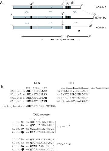 Figure 1. Primary Structure of Xenopus Cdc14α and Cdc14β phosphatases A. Schematic comparison of XCdc14α, XCdc14β and hCdc14A. The gray regions in hCdc14A correspond to the dual specificity phosphatase (DSP) domains identified in the crystal structure of hCdc14B. The nuclear export signal (NES), putative nuclear localization signal (NLS), and QGD repeats present in hCdc14A are conserved in XCdc14α and XCdc14β and are represented by shaded boxes. The asterisks represent the active site cysteines, and the circled p represents a canonical Cdk phosphorylation site (SPLK) located at residues 443–446 of XCdc14α. The solid lines at the bottom of the figure represent the regions of XCdc14α that were used for immunizations. Percentage identities between the subregions are indicated in grey. B. Alignment of the NLS, NES, and QGD sequences of hCdc14B, hCdc14A, XCdc14α and XCdc14β. Top left: hCdc14A, hCdc14B, XCdc14α, and XCdc14β contain putative bipartite NLS sequences that conform to the consensus motif (R/K)2X7–12(R/K)3,. The sequences are aligned with the bipartite NLS from nucleoplasmin. Top right: Alignment of the NES sequences that are present in all four Cdc14 homologs. The NES of hCdc14A was shown to be functional by mutational analysis [21]. The φ in the consensus motif signifies hydrophobic amino acids. Bottom: Alignment of conserved C-terminal QGD motifs.