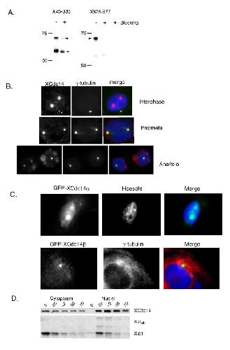 RESULTS: We identified two open reading frames from Xenopus laevis closely related to human Cdc14A, called XCdc14alpha and XCdc14beta, although no obvious paralog of the hCdc14B was found. To begin a functional characterization of Xcdc14alpha and XCdc14beta, we raised polyclonal antibodies against a conserved region. These antibodies stained both the nucleolus and centrosome in interphase Xenopus tissue culture cells, and the mitotic centrosomes. GFP-tagged version of XCdc14alpha localized to the nucleulus and GFP-XCdc14beta localized to the centrosome, although not exclusively. XCdc14alpha was also both meiotically and mitotically phosphorylated. Injection of antibodies raised against a conserved region of XCdc14/beta into Xenopus embryos at the two-cell stage blocked division of the injected blastomeres, suggesting that activities of XCdc14alpha/beta are required for normal cell division.