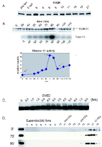 Figure 3. XCdc14α is mitotically phosphorylated during oocyte maturation and in the Xenopus embryonic cell cycle. A. XCdc14α protein levels are constant during development. Xenopus eggs were fertilized in vitro and at the indicated stages were frozen down for subsequent immunoblot analysis. B. XCdc14α is phosphorylated in mitosis in cycling Xenopus extracts. At the indicated times, samples from cycling extracts were frozen in liquid nitrogen for subsequent immunoblot analysis with anti-XCdc14α antibodies (top panel) and total histone H1 kinase activity (lower panel). For the immunoblot, lysates were resolved on 11% SDS PAGE gels. C. XCdc14α becomes phosphorylated after germinal vesicle breakdown (GVBD) in the maturing oocyte. Defolliculated Stage VI oocytes were induced to mature by the addition of progesterone (10 μg/ml). At the indicated times, oocytes were flash frozen for subsequent immunoblot analysis with antibodies against XCdc14α. GVBD occurred between 2 and 2.5 hrs. D. The majority of XCdc14α is monomeric or dimeric through the cell cycle. At 0, 70 and 90 min, samples from cycling extract were flash frozen in liquid nitrogen. Left: samples from the cycling extract were tested for total histone H1 kinase activity. Arrows indicate timepoints that were analyzed. Right: The frozen samples were diluted 10-fold in XB buffer, and 50 μg (1 μl equivalent of undiluted lysate) was fractionated on a Superdex200 gel filtration and probed with anti-XCdc14α antibodies. The elution profiles of molecular weight standards are depicted above the fractions.