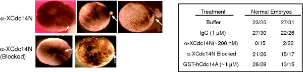 Figure 4. Injection of anti-XCdc14α/β antibodies into Xenopus embryos blocks cell division. One cell of 2-cell Xenopus embryos was injected with 10 nL of XB Buffer, purified rabbit IgG (final concentration ~1 μM), anti-XCdc14α/β antibodies (~200 nM final concentration), anti-XCdc14α/β antibodies pre-incubated with the immunizing antigen (Blocked), or GST-hCdc14A (1 μM). Left: examples of embryos injected with α-XCdc14α/β antibodies (top) or pre-blocked α-XCdc14α/β antibodies. Right: summary of two independent experiments. Embryos were analyzed at the 32-cell stage, and only embryos with an obvious large blastomere phenotype were considered abnormal.