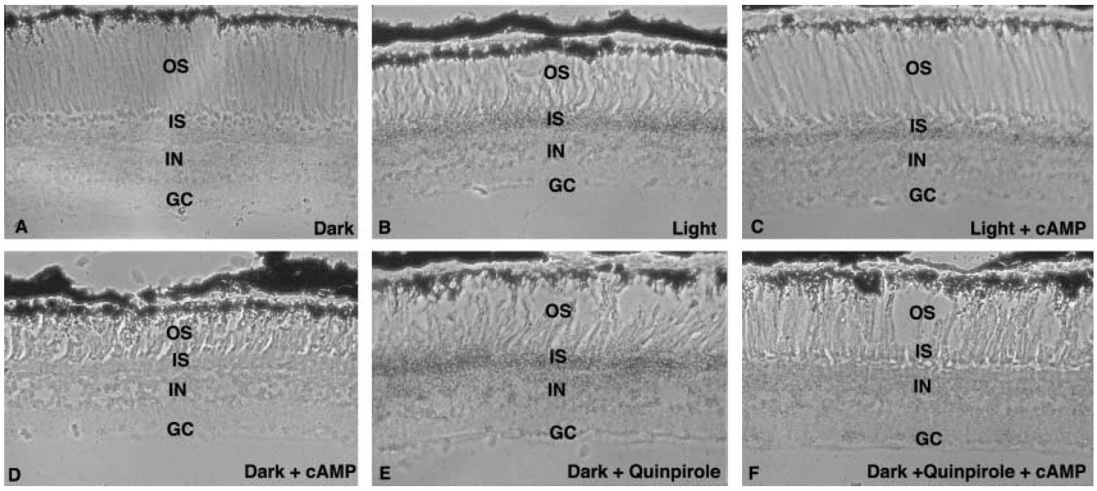 quinpirole is blocked by pCPT-cAMP. Shown are phase contrast images of unstained retinal sections from eyecups treated 3 h in darkness (A), light (B), light plus