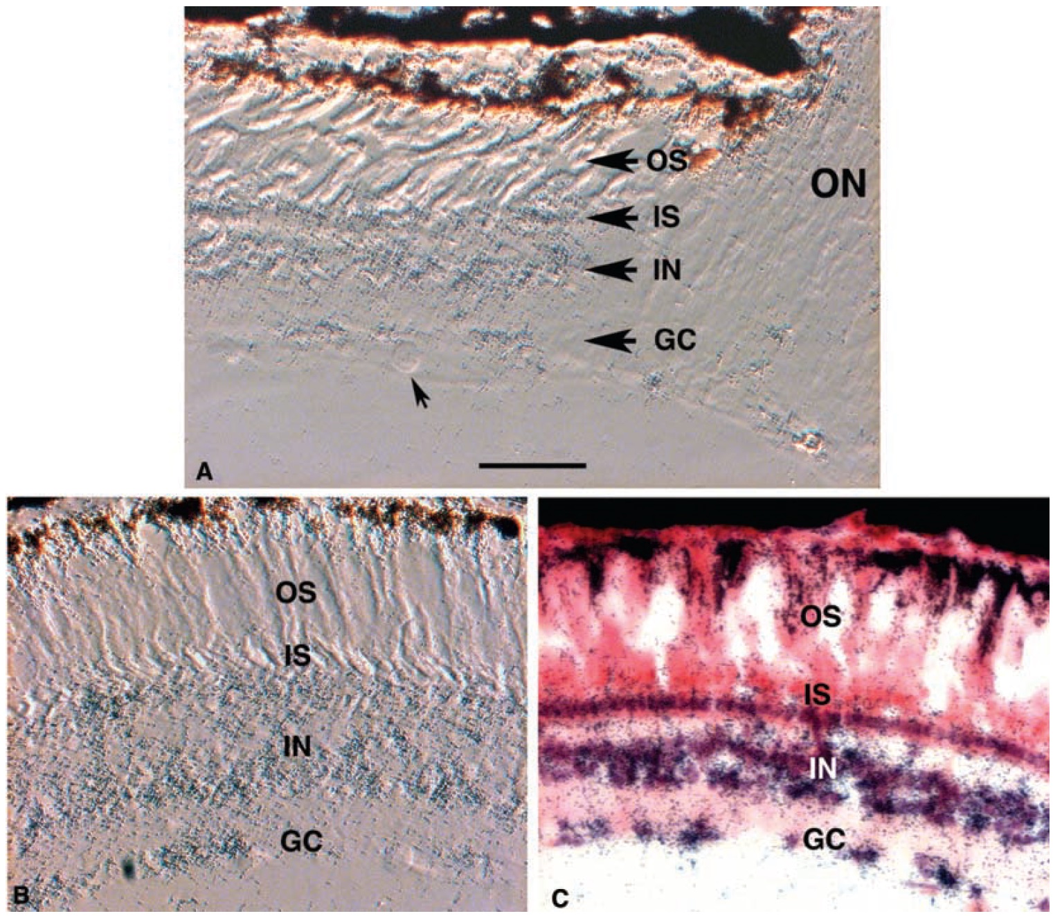 (ON) showing a low level of hybridization in the optic nerve and plexiform layers and a high level of hybridization over inner segments, inner nuclear layer and