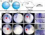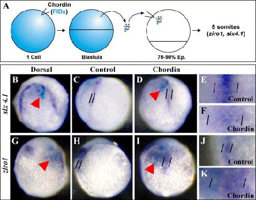 Fig. 5. Induction of preplacodal markers by chordin expressing cells (A). Five hundred picograms of Chordin mRNA and 7 ng/μl of FLDx were injected at the one-cell stage and the embryo cultured until the blastula stage, when ectodermal cells were dissociated and grafted into the lateral ectoderm of a gastrula stage embryo (70–90% epiboly). The grafted embryos were cultured until the one- to two-somite stage, and the expression of preplacodal markers was analyzed by in situ hybridization. The grafted cells were visualized by alkaline phosphatase-mediated FITC inmunostaining and recognized by the blue color of the FLDx staining; they are indicated by a red arrowhead. (B–F) Analysis of Six4.1. (B) Dorsal view. Control (C) and grafted (D) sides of embryo shown in B. (E, F) Higher magnification of embryos shown in C and D. Note that the preplacodal marker is expanded a few cell diameters on the side that received the graft, but the border of expression is not as sharp as on the control side (E, F). (G–K) Analysis of ziro1. (G) Dorsal view. Control (H) and grafted (I) sides of the embryo shown in G. (J, K) Higher magnification of embryos shown in H and I. Note that the preplacodal marker is expanded a few cell diameters on the side that received the graft (E, F). |