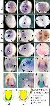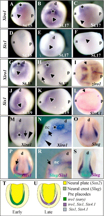 Fig. 1. The iro genes are expressed in the placodal field of Xenopus and zebrafish embryos. In situ hybridization of iro1, preplacodal, placodal, and neural crest markers was performed at different stages of Xenopus (A-H, J, K, M-S) and zebrafish embryos (I, L). a: anterior; p: posterior; d: dorsal; star: neural plate expression of iro1; arrowhead: preplacodal expression of iro1. (A) Xiro1 expression in a stage 15 embryo. Lateral view. (B, C) Xiro1 expression in a stage 17 embryo, in an anterior (B) and lateral (C) view. (D) Six1 in situ hybridization of a stage 15 embryo. Lateral view. (E, F) Six1 expression in a stage 17 embryo, in an anterior (E) and lateral (F) view. (G, H) Xiro1 expression in a stage 19 embryo, in an anterior (G) and lateral (H) view. (I) ziro1 expression in a tail bud stage zebrafish embryo (10.5 h postfertilization, hpf). Dorsal view, arrow indicates the preplacodal domain of expression. (J, K) Xiro1 expression in a stage 19 embryo, in an anterior (J) and lateral (K) view. (L) Six4.1 expression in a tail bud stage zebrafish embryo (10.5 h postfertilization, hpf). Dorsal view, arrow indicates the preplacodal domain of expression. (M) Xiro1 expression in a stage 21 embryo, dorsal view, posterior to the top. Arrow indicates the gap of expression between the neural (star) and placodal (arrowhead) expression of Xiro1. (N) section of embryo shown in M. (O) Slug expression in a stage 20 embryo. Dorsoanterior view. (P) Double in situ hybridization of a stage 20 embryo for Six1 (purple) and Slug (green). Anterior view. (R) Section of embryo shown in P. Note the gap in the expression of both genes indicated by the arrowhead. (S) Double in situ hybridization of a stage 20 embryo for Slug (purple) and Sox2 (green). Anterior view. (T, U) Summary of neural plate, neural crest, and preplacodal markers, for early (T) and late (U) neurula stages. |