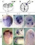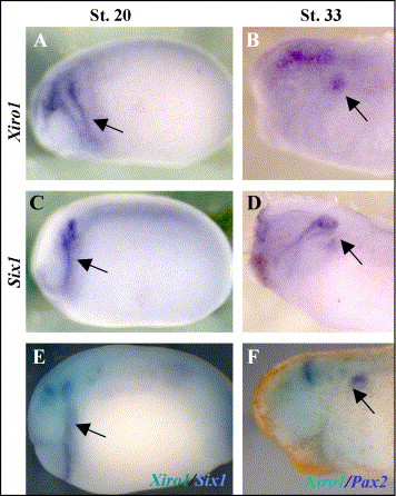 Fig. 2. Expression of MXiro1 at later stages. Anterior to the left, dorsal to the top: arrow, indicates placodal expression. (A, B) Xiro1 expression at stage 20 (A) and 33 (B). (C, D) Six1 expression at stage 20 (C) and 33 (D). (E) Double in situ hybridization for Xiro1 (green) and Six1 (purple) at stage 20. (F) Double in situ hybridization for Xiro1 (green) and Pax2 (purple) at stage 33. Arrow in F indicates the otic placode. |