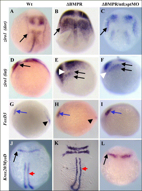 Fig. 4. Specification of the preplacodal field by BMP in zebrafish embryos. Ten hours postfertilization embryos analyzed by whole-mount in situ hybridization for the expression ziro1 (AF), FoxD3 (GI), and Krox20/MyoD (J, L). A-C and J-L are shown in dorsal view with anterior to the top, while DI are shown in lateral view with anterior to the left. The placodal domains of ziro1 expression is indicated with arrow. Blue arrow: neural crest; white arrowhead: absence of ziro1 expression in the neural crest; black and red arrowhead: mesoderm. (A, D, G, J) Wild-type embryos. (B, E, H, K) Embryos injected at the one-cell stage with 100 pg of BMPR mRNA: note the expansion in the midbrain, hindbrain, and placodal field of ziro1 expression, and the moderate expansion of the neural crest and mesoderm domains. (C, F, I, L) Embryos injected at the one-cell stage with 100 pg of BMPR mRNA and a mixture of ntl and spt morpholinos to inhibit mesoderm formation. Note the expansion of the placodal domain of ziro1 (C, F), the moderate expansion of FoxD3 and Krox20 (I, L), and the absence of MyoD expression (L). Note that the embryo in K is slightly older than the embryos in J and L, this is why two bands of Krox20 expression are seen in K, but only one in J and L. |
