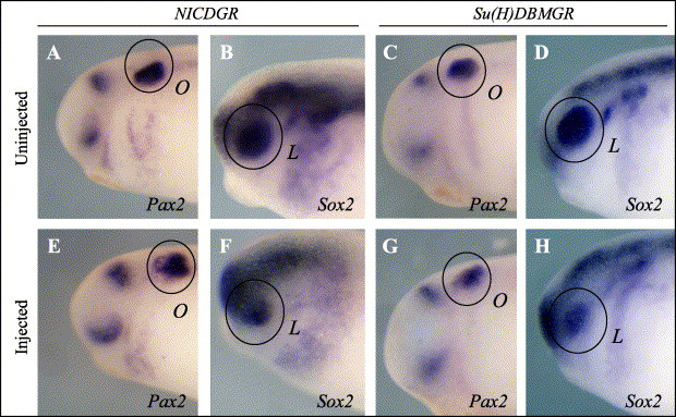 Fig. 8. Notch signaling on placode development. Two-cell stage embryos were injected in one blastomere with 0.7 ng of NICDGR (A, B, E, F) or 0.25 ng of Su(H)DBMGR (C, D, G, H). Injected embryos were cultured from stage 12 in medium containing dexamethasone and the expression Pax2 (A, E, C, G) and Sox2 (B, F, D, H) was analyzed by in situ hybridization. The injected side was recognized by alkaline phosphatase-mediated FITC immunostaining. The uninjected (A–D) and injected (E–H) sides of the same embryos are shown. The expression of markers in several placodes is indicated. O. otic; L: lens. (A, C, E, G). The injection of NICDGR does not produce any obvious effect in the expression of the otic placodal marker Pax2 (A, E) or the epibranchial placode marker Sox2 (B, F). The injection of Su(H)DBMGR does not have any effect on the expression of the otic placodal marker Pax2 (C, G) and the epibranchial placode marker Sox2 (D, H). Each experiment was done at least twice with a minimum of 45 embryos. |