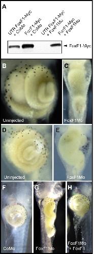 Fig. 2. Inhibition of FoxF1 function results in impaired gut morphogenesis. (A) Western blot analysis of FoxF1 protein tagged with a Myc epitope at the C-terminus using anti-Myc antibody. Translation of UTR FoxF1-Myc was blocked in the presence of FoxF1 morpholino (FoxF1Mo), but not by standard control morpholino (CoMo). Translation of FoxF1-Myc RNA lacking the 5â² UTR sequences was not inhibited by either CoMo or FoxF1Mo. (B) The ventral view of 5-day-old (stage 45/46) uninjected embryo and embryo injected with FoxF1Mo (2.2 pmol) into two ventral blastomeres at the 8-cell stage (C). Embryos injected with FoxF1Mo display gut elongation and looping defects. (D) The ventral view of 7-day-old (stage 46/47) uninjected and FoxF1Mo-injected embryos (E), showing that knockdown embryos still do not display normal gut morphogenesis. (F) The ventral view of stage 46/47 embryos injected with CoMo (2.2 pmol) showing normal gut morphogenesis. FoxF1Mo (2.2 pmol) injected embryos with mutant gut (G), can be rescued by co-injection of FoxF1 RNA (1.25 ng) (H).