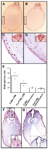 Fig. 5. A lower rate of lateral plate mesoderm proliferation in FoxF1 knockdown embryos. (A-D) Cell proliferation as visualized by BrdU incorporation (brown nuclear staining). Transverse sections through the midtrunk of stage-20 embryos injected with CoMo (A) or FoxF1Mo (B) show drastically reduced cell proliferation in the lateral plate mesoderm of FoxF1 knockdown embryos. The boxed areas are magnified in (C,D). (C) Higher magnification of the boxed areas in (A), showing BrdU-positive cells in the lateral plate mesoderm and in the neuroectoderm (inset) of a CoMo-injected embryo. (D) Higher magnification of the boxed areas in (B), showing a lack of BrdU-positive cells in the lateral plate mesoderm but a normal number of BrdU-positive cells in the neuroectoderm (inset) of a FoxF1Mo-injected embryo. (E) A column chart showing the numbers of BrdU-positive nuclei in the lateral plate mesoderm and neuroectoderm of CoMo- and FoxF1Mo-injected embryos at midtrunk level (averages±s.e.m.). Nuclei were counted on 10 sections derived from 5 control embryos and 20 sections from 11 FoxF1 knockdown embryos in two independent experiments. The difference in proliferation rate between control and knockdown lateral plate mesoderm is statistically significant (P=5.9 à 10-6 in a two-tailed t-test). LPM: lateral plate mesoderm. (F,G) TUNEL assay on stage-28 embryos injected with CoMo (F) and FoxF1Mo (G). Apoptotic cells (blue staining, inset) are mostly located in the neuroectoderm. No significant differences were observed between embryos injected with CoMo and FoxF1Mo.