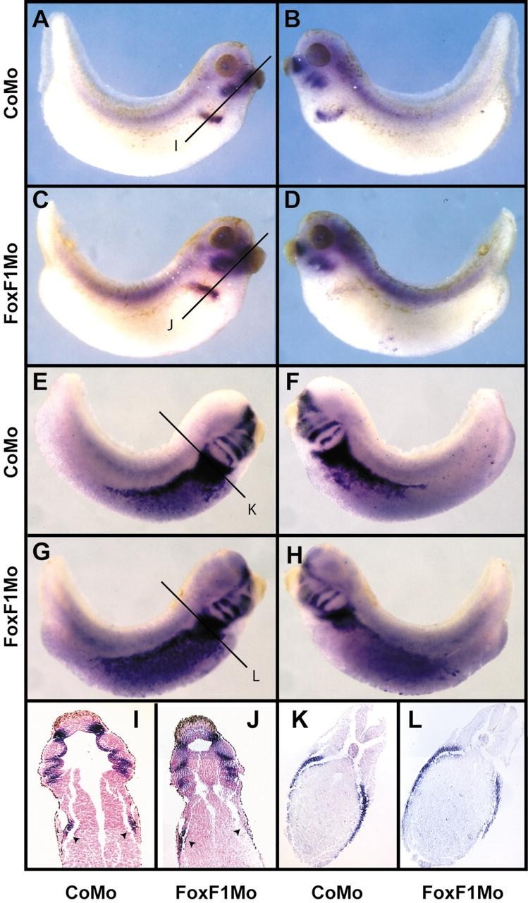 Fig. 4. Abnormal expression of Xbap in FoxF1 knockdown embryos. (A,B) Whole-mount in-situ hybridization showing Xbap [nkx3-2] expression on both sides of a CoMo-injected stage 35/36 embryo. A line with a letter in (A) indicates the position of the section in (I). (C,D) Whole-mount in-situ hybridization of Xbap RNA to a FoxF1Mo-injected stage 35/36 embryo. Xbap expression is present on the uninjected side (C) but is absent on the injected side (D). A line with a letter in (C) indicates the position of the section in (J). (E,F) Whole-mount in-situ hybridization showing FoxF1 expression on both sides of a CoMo-injected stage 35/36 embryo. A line with a letter in (E) indicates the position of the section in (K). (G,H) Whole-mount in-situ hybridization of FoxF1 RNA to a FoxF1Mo-injected stage 35/36 embryo. FoxF1 expression is present on both sides of the embryo. A line with a letter in (G) indicates the position of the section in (L). (I) A section through the embryo in (A) shows that Xbap is expressed in the CoMo-injected (shown as right) side as well as on the uninjected (left). (J) A section through the embryo in (C) shows that Xbap is expressed on the uninjected (left) side of a FoxF1Mo-injected embryo but not on the injected (right) side of a tadpole. (K) A section through an embryo hybridized with FoxF1 RNA shows that the lateral plate mesoderm is present on the CoMo-injected (right) side as well as on the uninjected side (left). (L) A section through an embryo hybridized with FoxF1 RNA shows that the lateral plate mesoderm is present on the FoxF1Mo-injected (right) side as well as on the uninjected side (left). Arrows point to the anteriorlateral plate mesoderm.