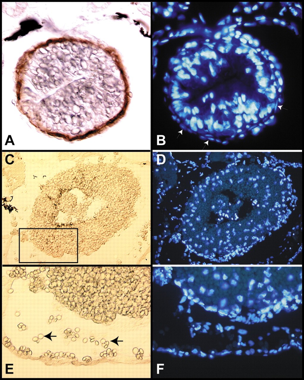 Fig. 3. FoxF1 is required for smooth muscle differentiation in the gut. Immunostaining with antibodies against α-smooth muscle actin on transverse sections through the hindgut of CoMo (A) and FoxF1 knockdown (C) embryos at stage 43/44. α-smooth muscle actin is expressed in the smooth muscle layer surrounding the gutendoderm (A) but absent in the knockdown embryo (C). (B,D) Nuclear staining by Hoechst dye on the same sections shows a layer of smooth muscle cells with elongated nuclei (arrows) surrounding the gut of CoMo-injected embryos (B), but highly disorganized gutmesoderm in knockdown embryos (D). (E) Close-up view of the area boxed in (C), visualizing the endodermal yolk platelets (arrows) in the visceral cavity.
