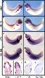 Fig. 1. Expression of FoxF1 during Xenopus development. (A,B) Embryos are shown with anterior to the left and dorsal to the top. (A) Whole-mount in-situ hybridization of a FoxF1 probe to a stage-25 embryo. FoxF1 expression is present in the neural crest-derived structures of the head and in the lateral plate mesoderm. At stage 30 the expression of FoxF1 intensifies and is also present in the ventralmesoderm (B). Letters with lines in (B) indicate the position of sections in (C,D). (C) Section through the head, branchial arches, and heart regions shows the lack of FoxF1 expression in the heart. (D) Section through the mid-trunk region of the embryo shows expression in the lateral plate mesoderm. (E) Ventral view of whole-mount in-situ hybridization of a stage-45 embryo shows FoxF1 expression in the gut. (F) Transverse section through the embryo shown in (E) demonstrates that FoxF1 transcripts are present in the splanchnic mesoderm (arrow).