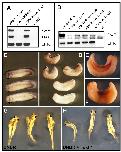 Fig. 6. FoxF1 is a target and a mediator of BMP4 signaling. (A) RT-PCR analysis of RNA isolated from animal caps injected with BMP4 RNA. Animal caps from embryos injected with BMP4 RNA (1.5 ng) into the animal blastomeres or uninjected embryos were dissected at stage 8 and collected when siblings reached stage 12.5. Xbra was used as a positive control for BMP4 induction and EF1α as a loading control. Lane 1 - RT-PCR on RNA from a whole embryo. Lane 2 - uninjected cap. Lane 3 - BMP4 injected cap. Lane 4 - no RT (no enzyme, RNA from the whole embryo). (B) RT-PCR analysis of RNA isolated from animal caps injected with BMP4 or Xbra RNA, or treated with FGF protein. Animal caps from embryos injected with BMP4 (1.5 ng) or Xbra (2.5 ng) RNA into the animal blastomeres or uninjected embryos were dissected at stage 8. Caps were collected when siblings reached stage 12.5 and assayed by RT-PCR. For FGF experiments, a set of uninjected caps was dissected at stage 8 and treated with 200 ng/ml bFGF for 1 hour. (C-F) Effects of FoxF1 RNA injection on the morphology of Xenopus embryos. Two dorsal blastomeres at the 4-cell stage were injected with FoxF1 RNA (0.4-1 ng), and phenotypes were analyzed at stage 28-30. The injected embryos (D) show different degrees of ventralization, while their siblings (C) display normal morphology. (E,F) The right (E) and left (F) side of a stage-30 embryo injected in the left side with FoxF1 RNA immunostained with 12/101 antibodies that recognize somatic mesoderm. The left side of the embryo shows a significant reduction of this marker. (G,H) FoxF1 RNA can rescue axis duplication caused by the injection of dominant-negative BMP receptor (DNBR). (G) Embryos injected with DNBR RNA (1.5 ng) showing axis duplications. (H) Embryos injected with DNBR and FoxF1 RNA (1.5 ng, 1.25 ng) demonstrate that FoxF1 RNA can rescue the DNBR phenotype.