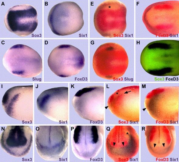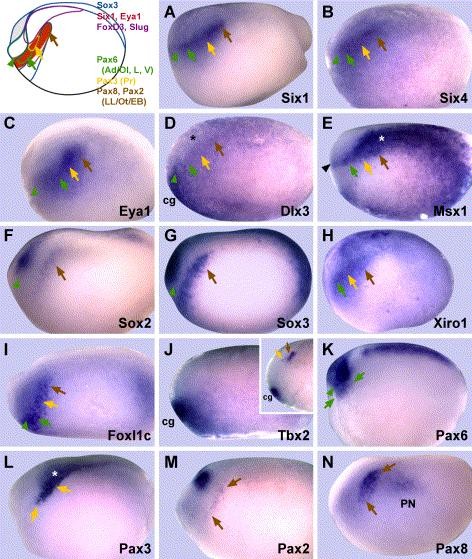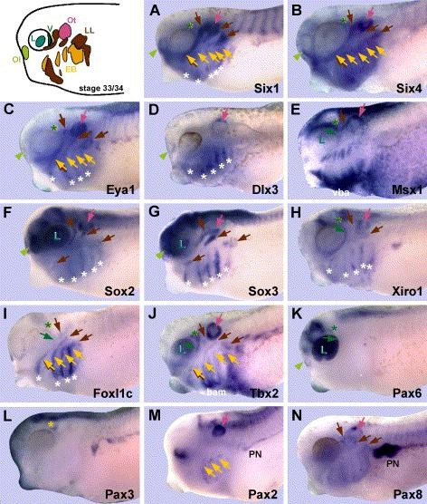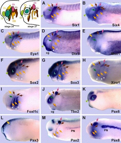 Genes referenced: bcl2l11 dlx3 eya1 foxd3 foxi3 frzb2 irx1 msx1 neurog2 nppa pax2 pax3 pax6 pax8 pnp six1 six4 snai2 sox2 sox3 tbx2 tbx3