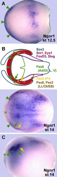 Fig. 3. Expression of Ngnr1 in neural plate stage Xenopus embryos. Green arrowheads identify placodal gene expression immediately rostral to the anterior neural plate border (medial arrowhead: prospective adenohypophysial placode, lateral arrowheads: prospective olfactory placodes), whereas green arrows identify placodal gene expression rostrolateral to the anterior neural plate (prospective lens and trigeminal placodes), and yellow arrows identify the prospective profundal placode. (A) Stage 12.5 embryo in dorsal view. Ngnr1 is expressed in an arc around the anterior neural plate. (BâC) Stage 14 embryo in dorsal (B; upper panel shows schematic drawing of various placodal gene expression domains for comparison) and lateral view (C). Ngnr1 is downregulated in the region of the prospective adenohypophysial placode (large asterisk) as well as in the region of the prospective lens placode (small asterisk). |