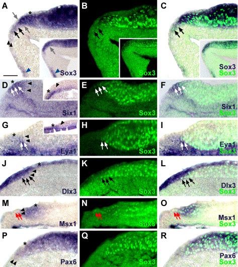 Fig. 5. Positioning of gene expression domains at the anterior neural plate border as revealed by double-staining procedures in sagittal sections (anterior is to the left) of neural plate stage Xenopus embryos (stages 13â14). For each gene analyzed, a first panel depicts gene expression at the anterior neural plate border, a second panel shows the pattern of nuclear Sox3 immunostaining in the same section (apparent nonnuclear staining in the endoderm is an artifact due to autofluorescence of yolk granules), and a third panel presents a superposition of the first two panels. (AâC) Distribution of Sox3 expression (A) and Sox3 immunostaining (B). The anterior border of the neural plate is indicated by grey arrows. The superficial ectodermal layer is indicated by asterisks. Sox3 expression and immunostaining is found in the superficial (in the domain marked by a white asterisk) and deep ectodermal layers. The rostral limit of expression in the deep ectodermal layer (black arrowheads) extends beyond the neural plate border. Cells within this area of Sox3 expression rostral to the neural plate border are also immunopositive for Sox3 (black arrows). However, no Sox3-immunopositive cells are yet discernible in the lateral crescent-shaped domain of Sox3 expression (identified by blue arrowheads in A) as is particularly evident in the inserts of AâC depicting sections of the same specimen at a more lateral level. (DâR) Comparison of the expression pattern of Six1 (DâF), Eya1 (GâI), Dlx3 (JâL), Msx1 (MâO), and Pax6 (PâR) at the anterior neural plate border with Sox3 immunostaining. Inserts in D and G show Six1 and Eya1 expression patterns, respectively, in additional specimens. The borders of expression of each gene in the deep ectodermal layer are indicated by arrowheads. Double-labeled cells, which show expression of the respective gene as well as Sox3 immunostaining, are identified by black or white arrows. Because Pax6 expression and Sox3 immunoreactivity are largely coextensive, double-labeled cells are not specifically marked in PâR. Black asterisks indicate the superficial ectodermal layer (which is artifactually missing in D). White asterisks in L indicate cells in the superficial ectodermal layer that express Dlx3 and are Sox3 immunopositive (posterior border ofDlx3 expression is immediately to the right of panel). Red arrows in MâO indicate Sox3-immunopositive cells located rostral to the domain of Msx1 expression in the anteriormost neural plate. Scale bar in A: 100 μm (for all panels). |