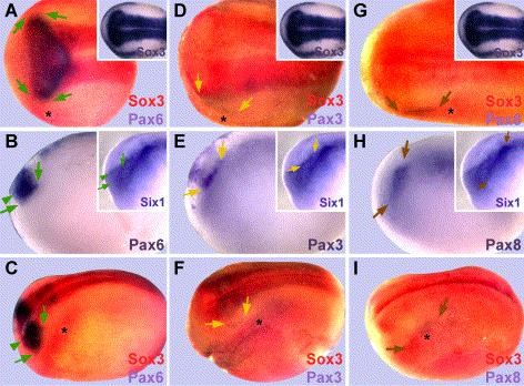 Fig. 7. Positioning of Pax gene expression domains relative to Sox3 as revealed by whole mount double in situ hybridization. Dorsal views (A, D, and G) of neural plate stage Xenopus embryos (stage 14; anterior to the left) and lateral (B, E, and H) and oblique dorsolateral (C, F, and I) views of neural fold stage Xenopus embryos (stage 16; anterior to the left) demonstrating the position of Pax6 (AâC), Pax3 (DâF), and Pax8 (GâI) expression domains relative to Sox3 expression. Inserts in A, D, and G show Sox3 expression individually for clarification. Asterisks indicate lateral domain of Sox3 expression. Arrows indicate anterior and posterior borders of placodal expression domains for Pax6 (green arrows: prospective lens and trigeminal placodes, AâC), Pax3 (yellow arrows: prospective profundal placode, DâF), and Pax8 (brown arrows: posterior placodal area, GâI). The green arrowhead in B and C indicates Pax6 expression in the lateral part of the anterior placodal area (prospective olfactory placode). Inserts in B, E, and H identify the corresponding subdomains of Six1 expression. |