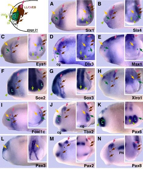 Fig. 9. Placodal gene expression patterns in early tail bud Xenopus embryos (stages 21â22) in lateral views (anterior is to the left) and right frontal views (inserts). Color-coded arrows and arrowheads are used for the identification of comparable regions of gene expression. Expression in the prospective lens placode (which is not yet thickened at this stage) is indicated by L. Colors are explained in the schematic drawing, which shows the distribution of placodes in a stage 21 embryo (modified after Schlosser and Northcutt, 2000; see Fig. 14 for detailed explanation). The unpaired adenohypophysial placode is located medial to the ventral part of the olfactory placode and is, thus, hidden behind the olfactory placode in this lateral perspective (indicated by light green arrow and Ad in brackets). Various shades of green identify placodes (including the prospective lens placode) expressing Pax6, yellow identifies the profundal placode expressing Pax3, and brown and pink jointly identify the posterior placodal area expressing Pax2 and Pax8, with pink being reserved for the subregion, which will form the otic vesicle. Blueâgreen asterisks indicate downregulation of the respective genes in the region of the prospective lens placode, whereas brown asterisks indicate downregulation of the respective genes in a region intervening between the anterior and posterior subregions of the posterior placodal area. The pink and brown asterisks in I indicate downregulation of FoxI1c expression in the dorsal part of the posterior placodal area. For detailed description, see text. For additional abbreviations, see Fig. 1. |